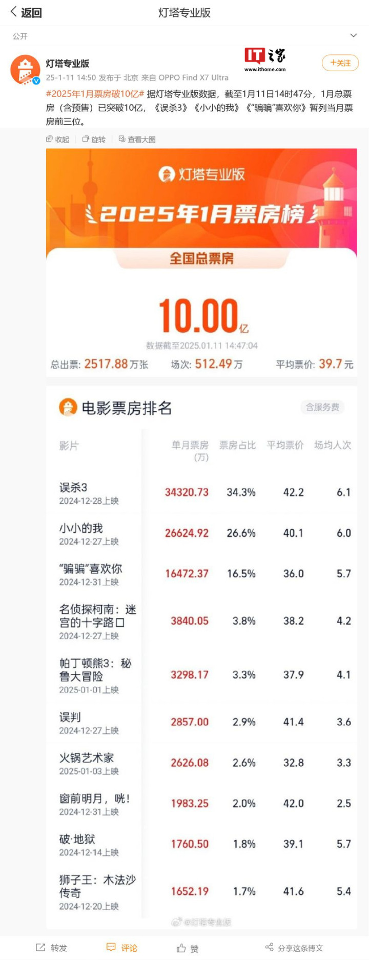 IT之家1月11日音信,凭证灯塔专科版数据,搁置今天14时47分,2025年1月总票房(含预售)已遏制10亿元东说念主民币,《误杀3》《小小的我》《“骗骗”可爱你》暂列当月票房前三位。