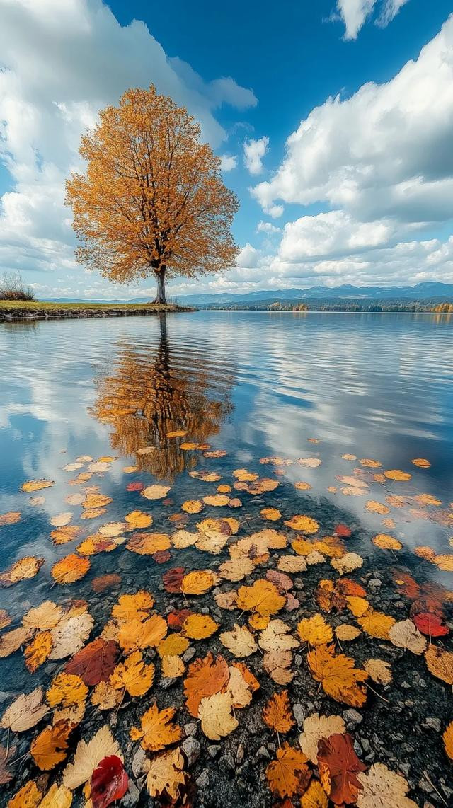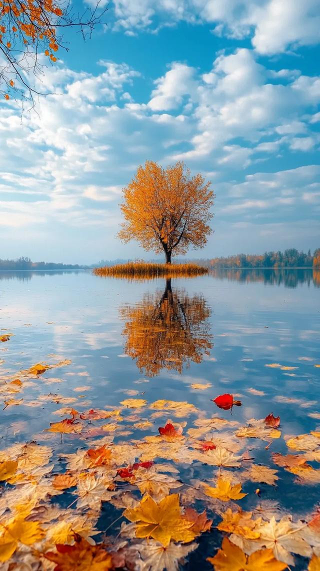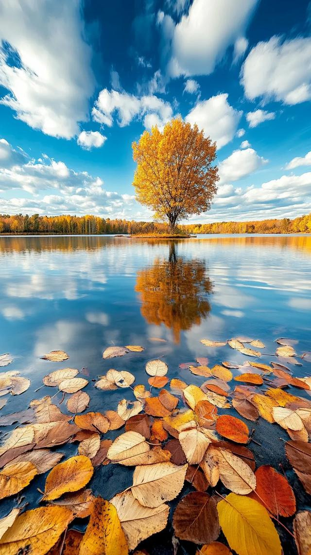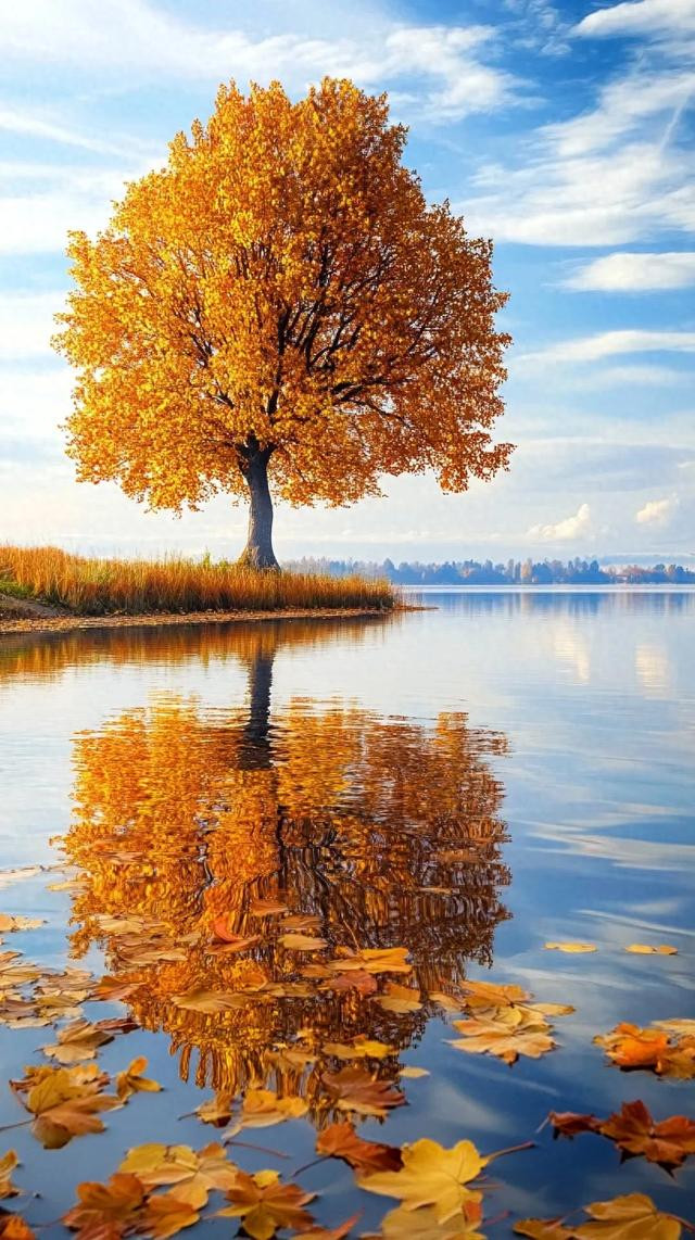 远方湖岸上有一棵孤零零的参天大树,树上尽是金黄的树叶,在蓝天白云的烘托下,显得格外秀好意思。这棵树是画面的焦点,它不仅特出了秋天的主题,还为画面增添了深度和线索感。