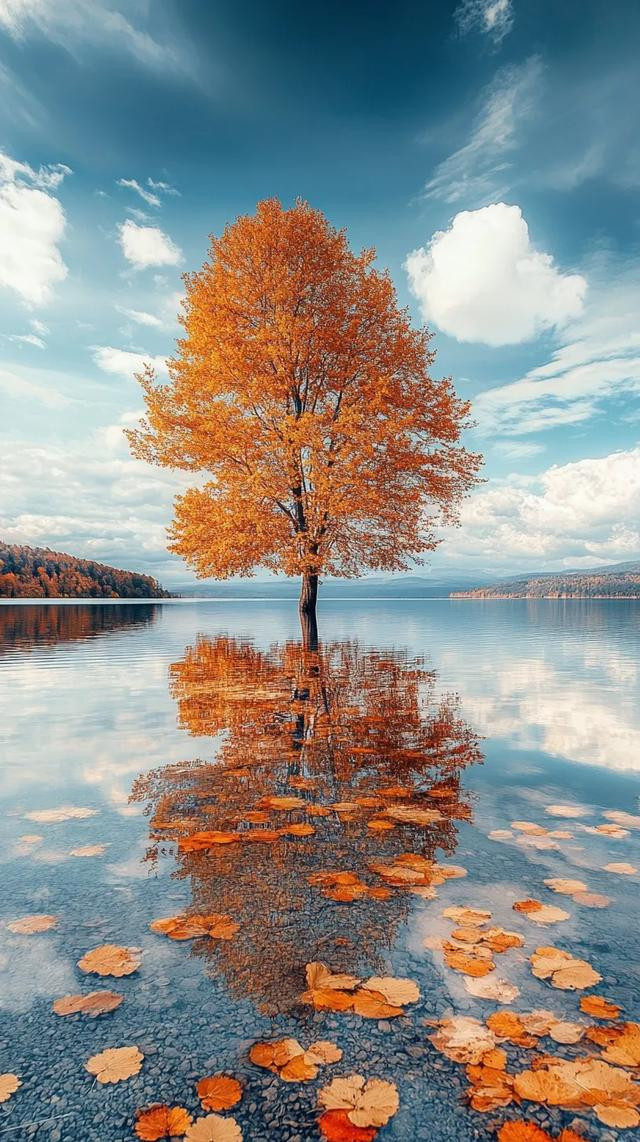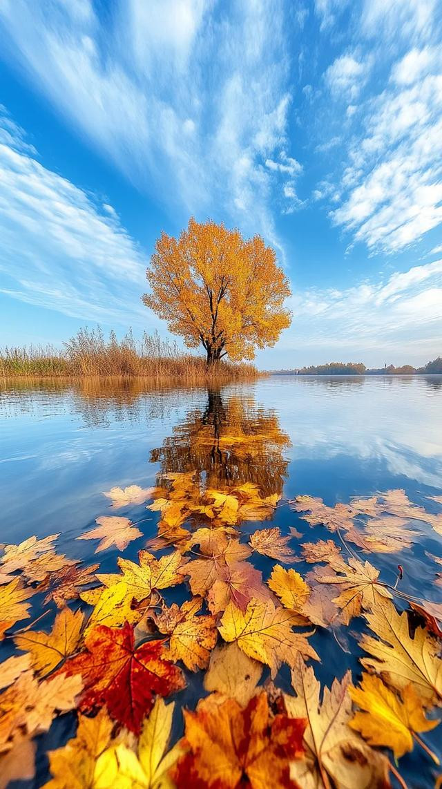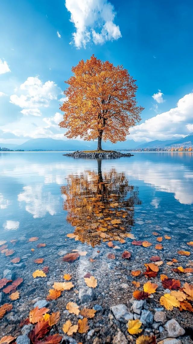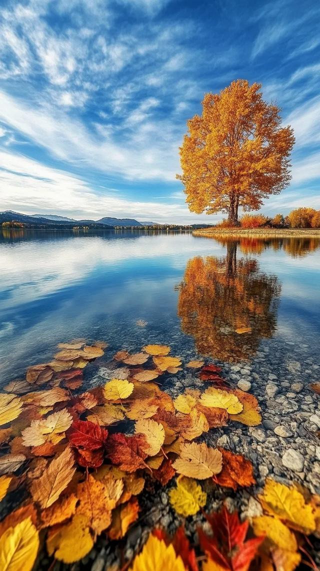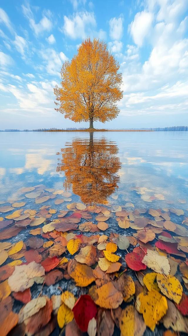 远方湖岸上有一棵孤零零的参天大树,树上尽是金黄的树叶,在蓝天白云的烘托下,显得格外秀好意思。这棵树是画面的焦点,它不仅特出了秋天的主题,还为画面增添了深度和线索感。