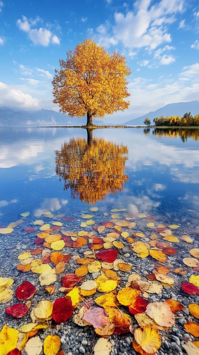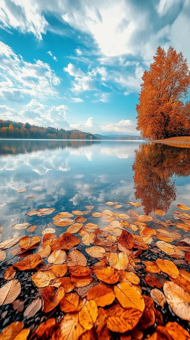 秋天,是一个色调斑斓的季节,亦然一个充满诗意的季节。在这幅画中,咱们不错看到湖面上洒落的黄色和红色的落叶,为画面增添了秋天的气味。湖水廓清见底,像一面镜子,反照着岸边的风物,给东说念主一种宁静平缓的嗅觉。