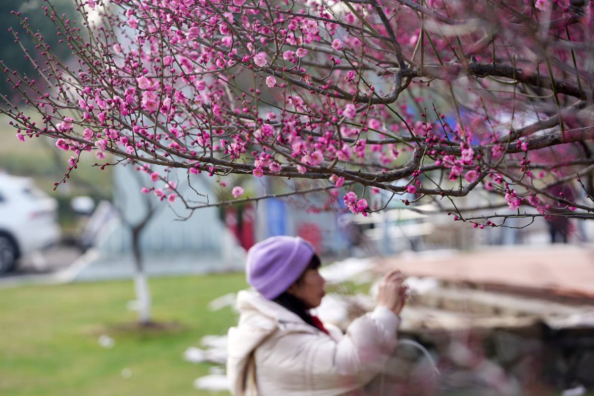 1月22日,武汉东湖高新区西苑公园,市民在空轨下赏梅、打卡。