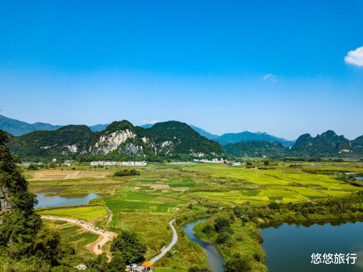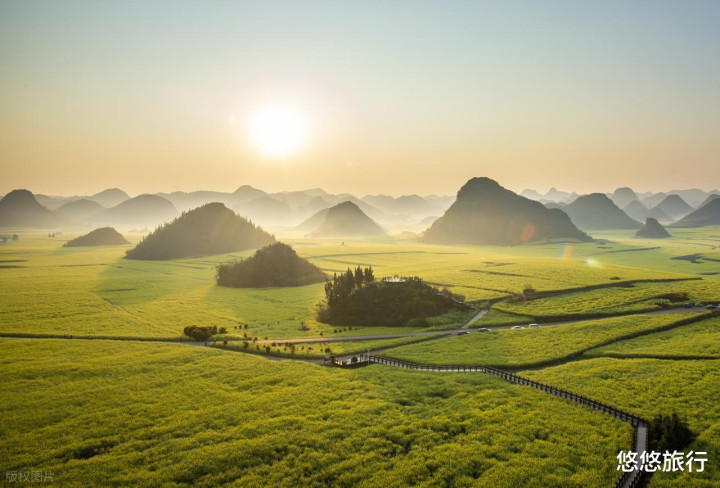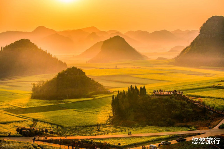 车子在花海里穿行,就像闯进油画,爬上金鸡峰丛不雅景台,晨雾裹开花香漫过来,数十万亩油菜花与喀斯特峰丛。日出日落时,阳光洒在油菜花上,暖烘烘的色调,太有春天的嗅觉了。