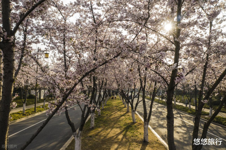 玫红色的山樱先开放,掉完长出繁盛的绿叶,粉樱接替开放,满地落樱像红地毯相通。