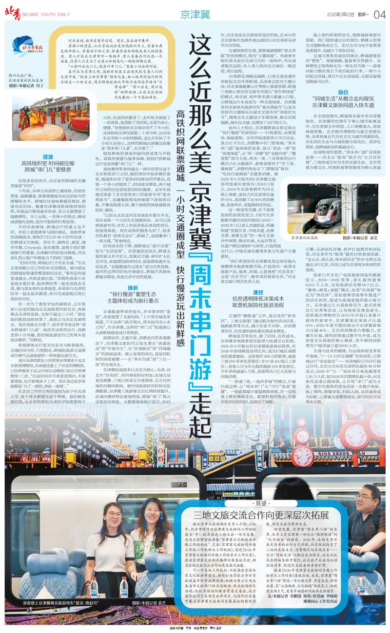交通提速带来的变化,并非浅显的“更快”,而是重塑了文旅结构。“上昼赏京城皇家底蕴,下昼品津门曲艺炊火,周末赴河北山水之约”,在京津冀,这样的“串门式”短途游已再行鲜体验变成日常图景。