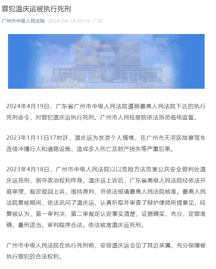 2024年4月19日,广东省广州市中级东谈主民法院罢职最妙手民法院下达的实行死刑号令,对作恶温庆运实行死刑。广州市东谈主民观测院照章派员临场监督。
