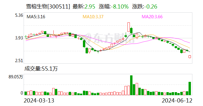 6月12日,雪榕生物(300511.SZ)低开低走,盘中一度跌超13%,最低跌至2.79元/股,创下自上市以来新低。为止收盘,最新股价为2.95元/股,日内跌幅8.1%。