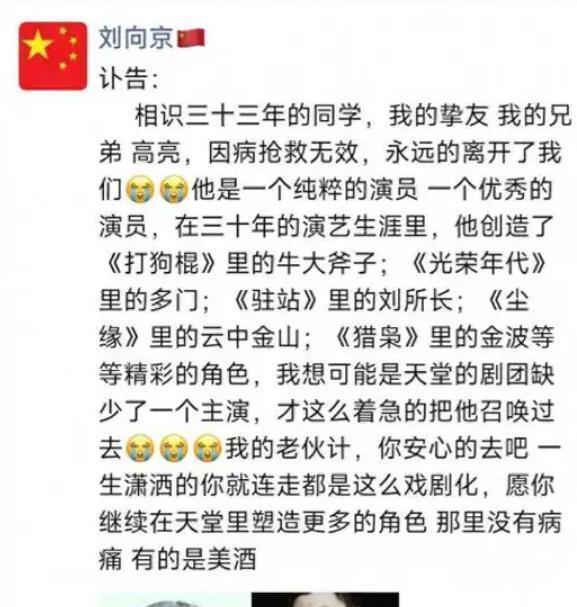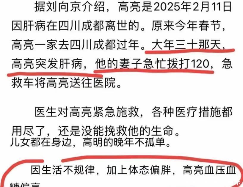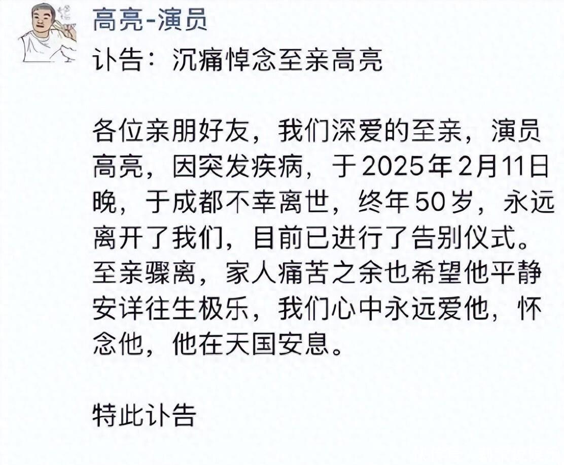 说出来你可能不信,大年头三晚上,50岁的高亮在成皆吃大除夜饭时蓦然倒下了。 这个在《打狗棍》里演得虎虎生风的"牛大斧子",连抢救室皆没能走出去。 更让东说念主揪心的是,他83岁的老父亲精熟,阿谁演惯了铁骨好汉的老戏骨,此刻正躲在病房旯旮,死死攥着犬子临了发的推拿视频——画面里他笑着说"爸,我给您按按腰"世博体育app下载,转瞬就成了阴阳两隔的遗言。
