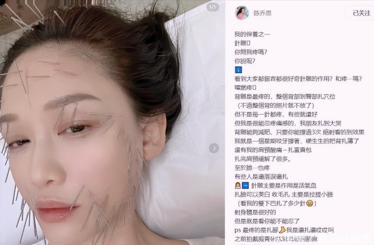 比拟之下,陈乔恩天然比陈紫函年青4岁,却需要通过中医诊疗,各式化妆品来保管现象。她曾在冒失平台上晒出我方接受针雕诊疗的像片,脸上、头上、脚上密密匝匝扎满了细针。
