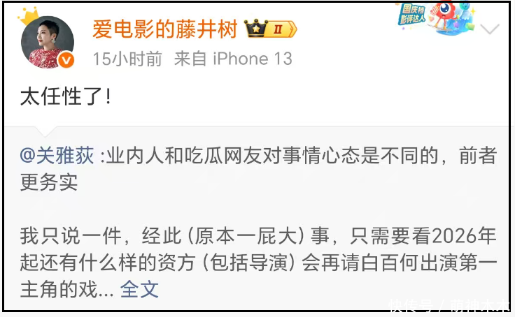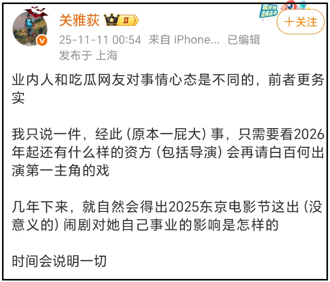 近日,就延续有业内东说念主士发文,称业内和网友的吃瓜心态不同,东京电影节这件事,将会对白百何的处事产生影响。另外一位制片东说念主则径直转发该博文,直言:“太率性了!”