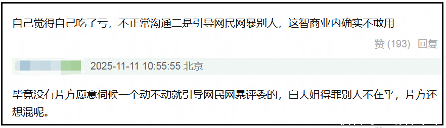两位诚然齐莫得明说,但从文中不错光显看出他们的格调——业内东说念主士今后要严慎启用白百何了。