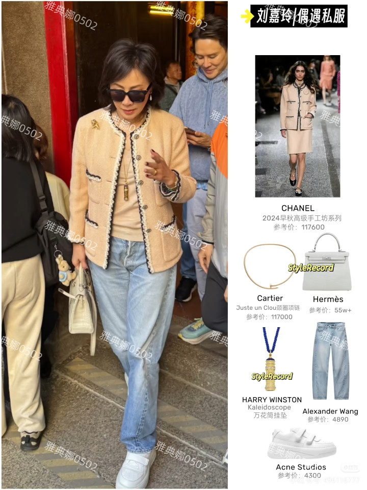 刘嘉玲穿了一件浅米色价值11万多香奈儿高等手工坊外衣,手上拎着白色爱马仕珍稀皮包包价值在55万以上,脖子上还戴了价值11万多的卡地亚钉子项圈,不算她戴的腕表珍珠耳饰墨镜,全身高下的行头就近百万了, 身上最低廉的单品是脚上那双小白鞋,价值也4000多块,真实相等英气不差钱。