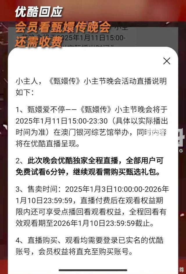 原来内行认为这是对剧迷的一种回馈,感谢粉丝对甄嬛传的疼爱。 本来内行对这场晚会期待值很高,不错看到许多老练的演员同聚一堂,聊一些创作的细节,看到实际中的演员和脚色和脚色的碰撞,然而万万莫得念念到,在驱动就让粉丝寒了心。 晚会会有长达八个小时的直播,是在优酷平台进行直播。 原来网友认为有了优酷会员就不错了,然而万万莫得念念到, 在有会员的基础上,还要突出付钱,是会员还要再突出付28元,不是会员要付38元才智不雅看。 这让许多网友直呼心寒, 吃相太出丑 !原来认为是回馈不雅众,回馈不雅众对该剧的守旧,但没念念到却是来一波圈钱!