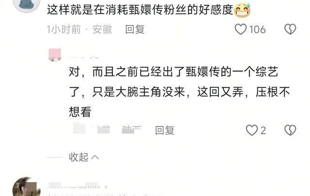 有网友暗示, 视频平台的这一瞥为,禁绝了网友对甄嬛传的好感,前十几年积聚的好感全在这整夜给败光了,这是在阔绰甄嬛传粉丝的好感度。况且之前仍是出了一个甄嬛传的综艺了,咫尺又来变着法的割韭菜吃世博shibo登录入口,相真实太出丑了。