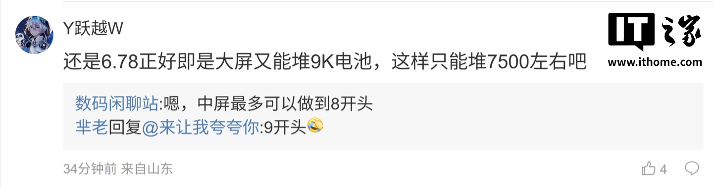 后续有效户在辩驳区推敲:“三星屏幕么”,博主复兴说念:“国产屏”;另又名用户则推敲说念:“仍是 6.78 碰巧就是大屏又能堆 9K 电板,这么只可堆 7500 傍边吧”,博主则复兴说念:“嗯,中屏最多不错作念到 8 起首”。