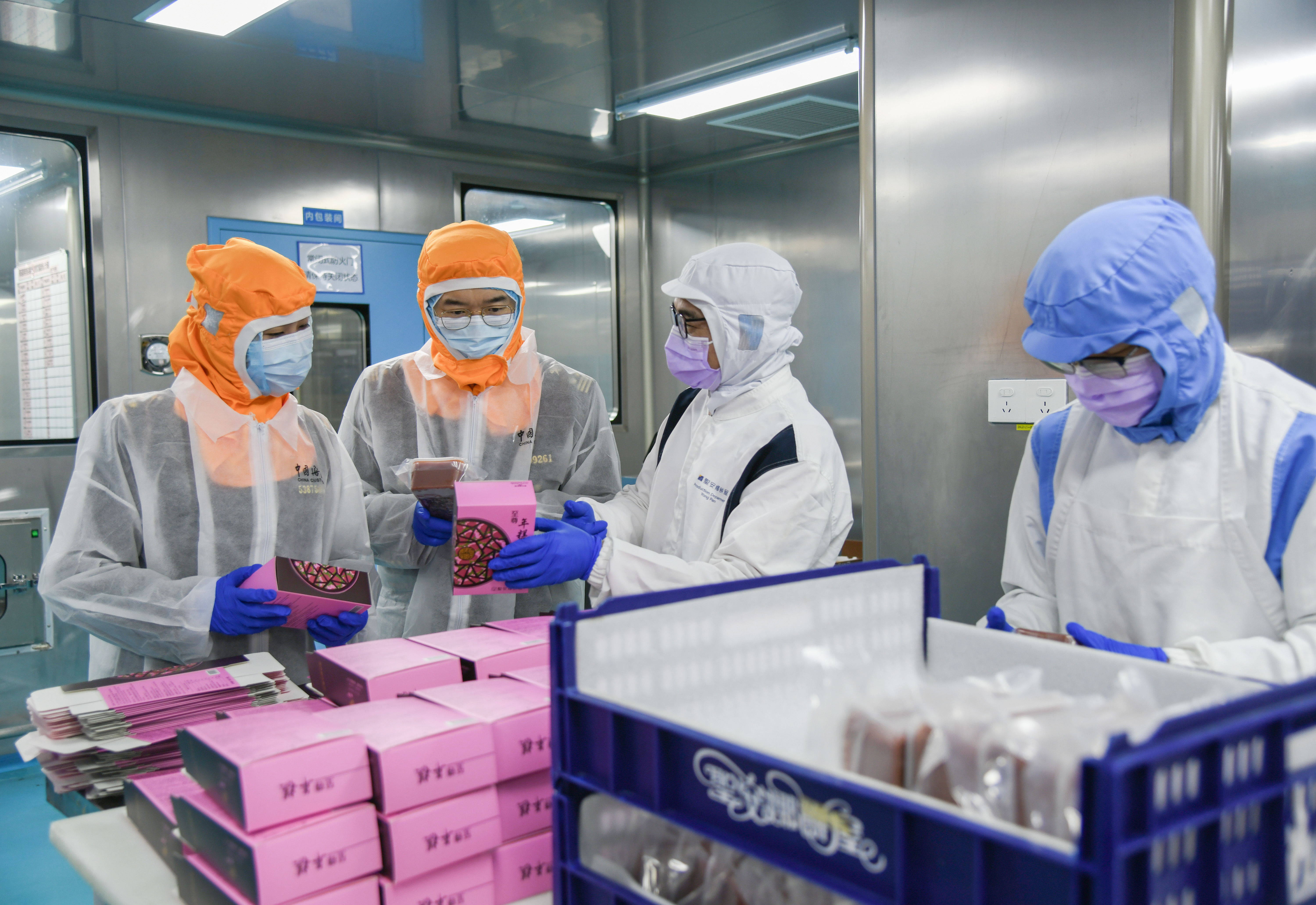 爱重海关关员对出口年糕进行监管检察。( 通信员 王丽欢 摄) 圣安娜饼屋(深圳)有限公司分娩车间内,自动化分娩线全速脱手,过程配料准备、混浆、落浆、蒸煮等工序,一个个汹涌澎拜、光芒金黄的年糕接连从分娩线滑落,甜香四溢。朱婷先容,这批承载着传统年味的年糕行将发往香港,为当地市民奉上新春好吃。