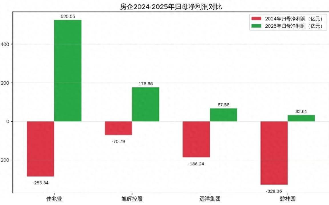 吉兆业、旭辉控股也接踵败露“利好”,2025年全年归母净利润差别录得525.55亿元和176.66亿元,同比差别增长284.19% 、349.66%。仅这四家房企,2025年所有归母净利润为802.38亿元,而在2024年则是所有亏空870.72亿元。